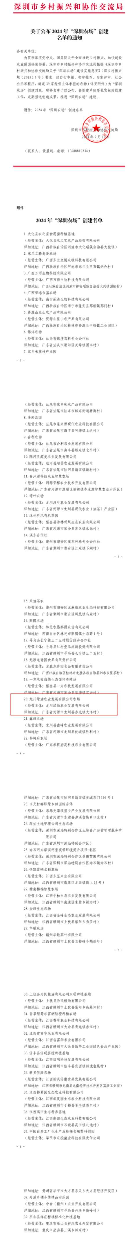 2024年9月,深圳市乡村振兴和协作交流局公布2024年“深圳农场”创建名单,“龙川绿油农业发展有限公司农场”荣幸入选。