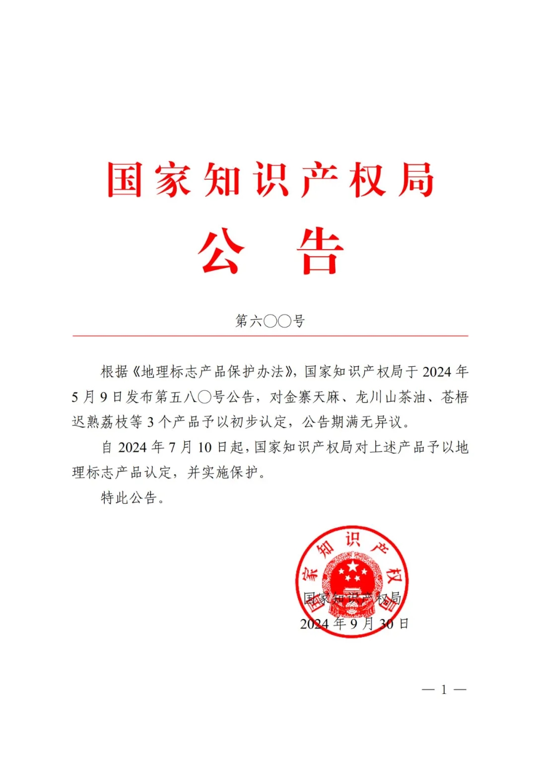 近日,国家知识产权局发布第六〇〇号公告,批准“龙川山茶油”为国家地理标志保护产品,自2024年7月10日起实施保护。这是龙川县首个国家地理标志保护产品,也是河源继“河源米粉”、“连平鹰嘴桃”、“紫金春甜桔”之后的第四个国家地理标志保护产品。